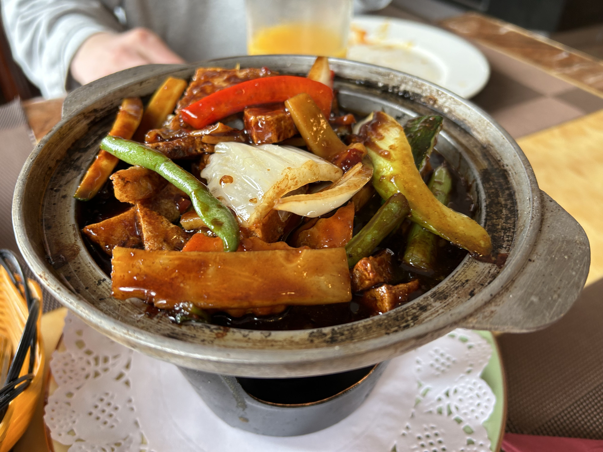 Täglich außer montags kann man bei Mr. Lee in den Genuss von chinesischem Essen kommen. Oder eben das, was hier als chinesisch-deutsch serviert wird. Das Mittagsbuffet ist eines der wenigen in der Stadt und ist wie eine große Schüssel, in die man alle umami-intensiven Gerichte, Zutaten und Beilagen reingeschmissen hat. Und weil das eben auch das Aushängeschild von Mr. Lee ist, bestellen die Mitgenommene und ich genau das. Meine Begleitung wählt aus der Karte die Buddhistische Fastenspeise mit Tofu, vorneweg eine Gemüsesuppe – ihr ist beim Buffet zu viel Fleisch dabei.