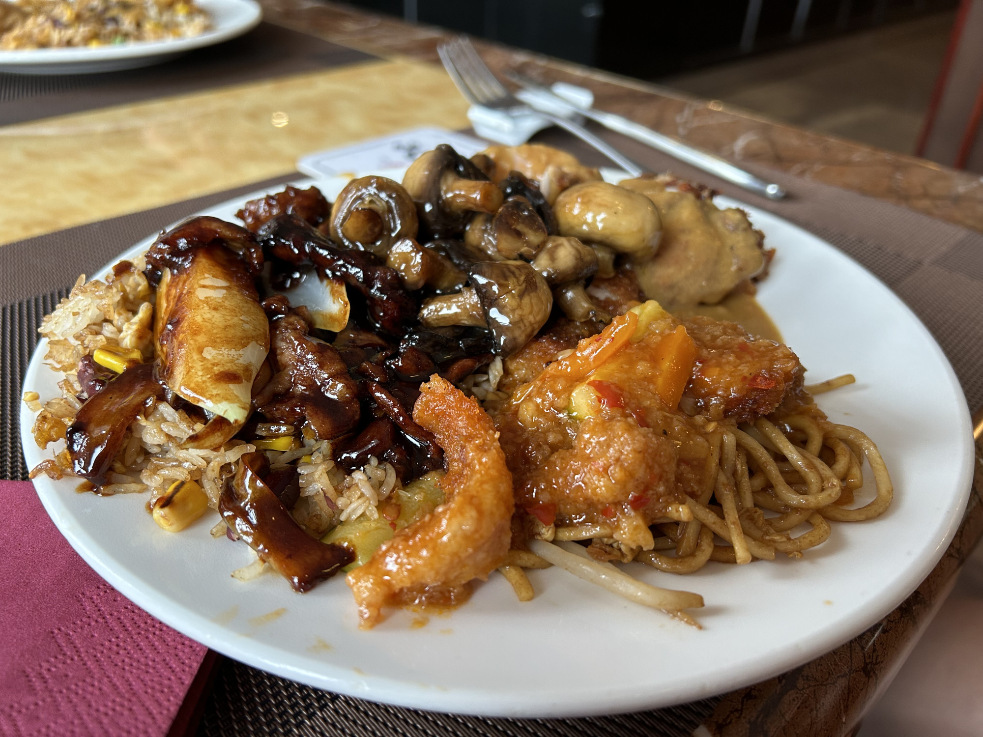 Vegetarier oder Veganer können versuchen, um die tierischen Produkte rumzunavigieren – das ist möglich. Klassisch erwarten einen da gebratene Nudeln und Reis mit Erbsen und Mais, dazu Riffelpommes und die allseits bekannten Frühlingsröllchen, die man sich im Sekundentakt genüsslich in den Mund schieben kann. Weitere Häppchen bieten die California Rolls, die neben der Salattheke darauf warten, aufgelesen zu werden.