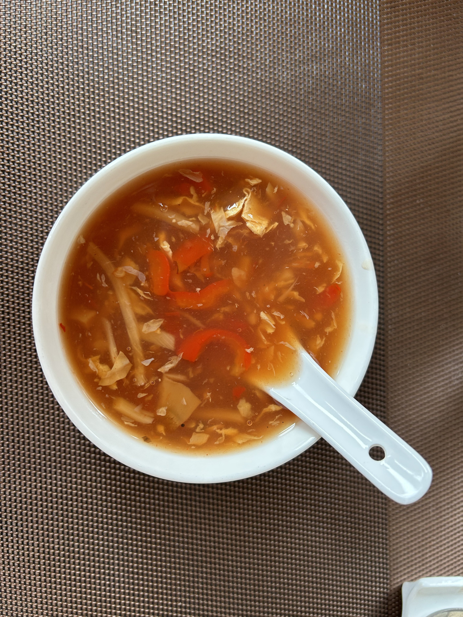 Auch sie gehört zum Buffet dazu: die Gemüsesuppe. Schmeckt klassisch pikant, die Ei-Fäden wirken nur optisch wie Fleisch.
