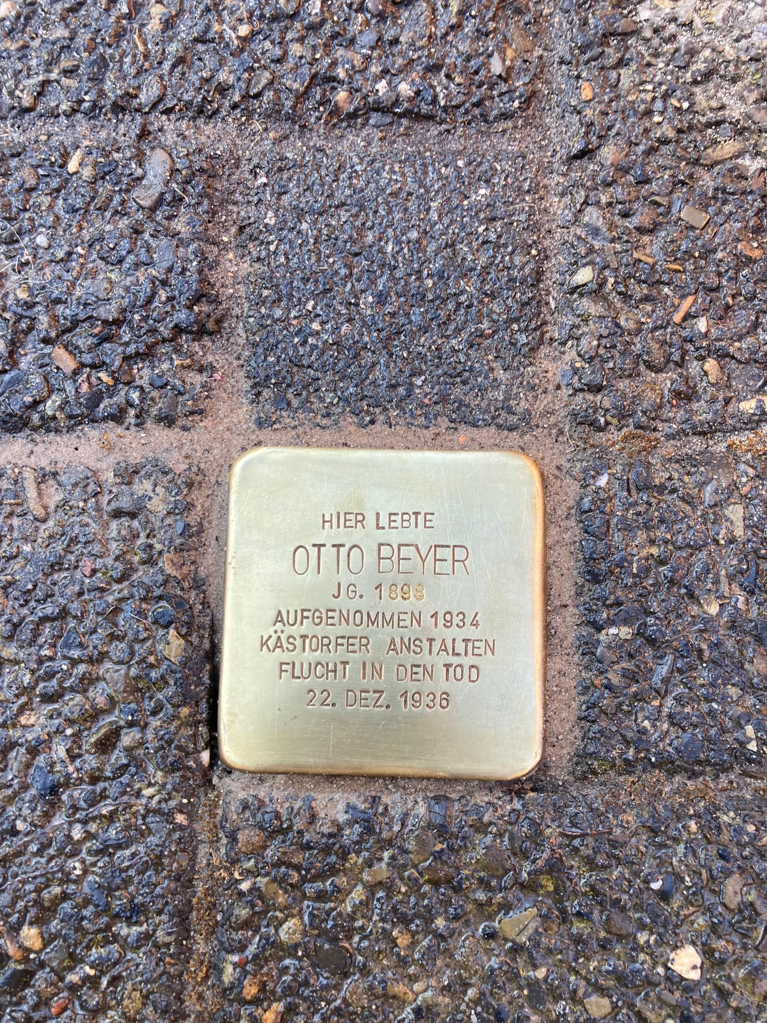 Wo Otto Beyer bestattet und ob seine in Braunschweig lebende Familie über seinen Tod unterrichtet wurde, ist nicht überliefert. In der Pflege- und Heilanstalt Hildesheim stieg, wie in vielen Einrichtungen im damaligen Deutschland, die Sterberate während der NS-Zeit erheblich an, da die psychisch kranken und geistig behinderten Menschen, die dort lebten, stark vernachlässigt oder im späteren Verlauf der „wilden Euthanasie“ ab 1942, auch „Aktion Brandt“ genannt, ermordet wurden. Über die zwei Jahre, die Otto Beyer in der Heil- und Pflegeanstalt Hildesheim lebte, ist nichts bekannt, da viele Akten während der Bombenangriffe auf Hildesheim vernichtet wurden. Die Suche nach Angehörigen blieb erfolglos.