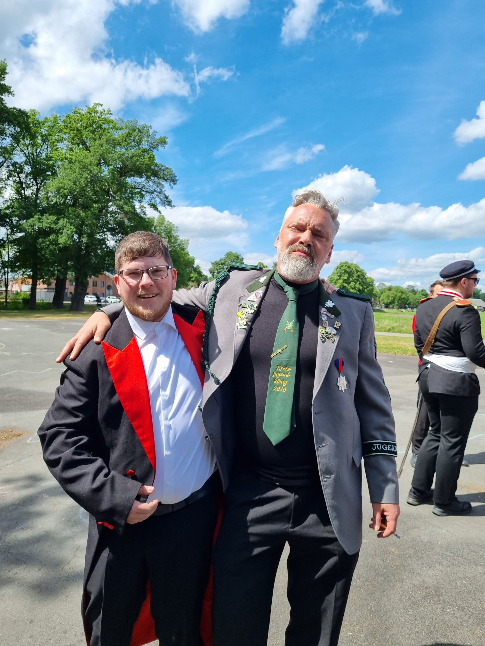 Marcel, Sohn des Gamsener Schützenkönigs Günter Licht, tauscht die Uniform mit einem Fanfarenspieler.