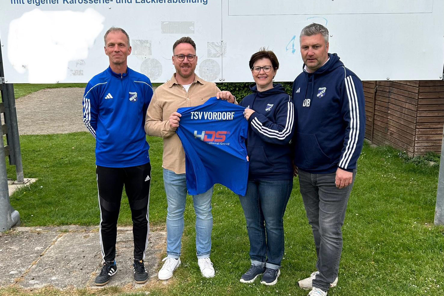 Der Sportliche Leiter Daniel Unger (links) und die Vorstandsmitglieder Dennis Busch (rechts) sowie Torgard Liebich (2. von rechts) präsentieren mit Kai Olzem den Cheftrainer für die neue Spielzeit beim TSV Vordorf.