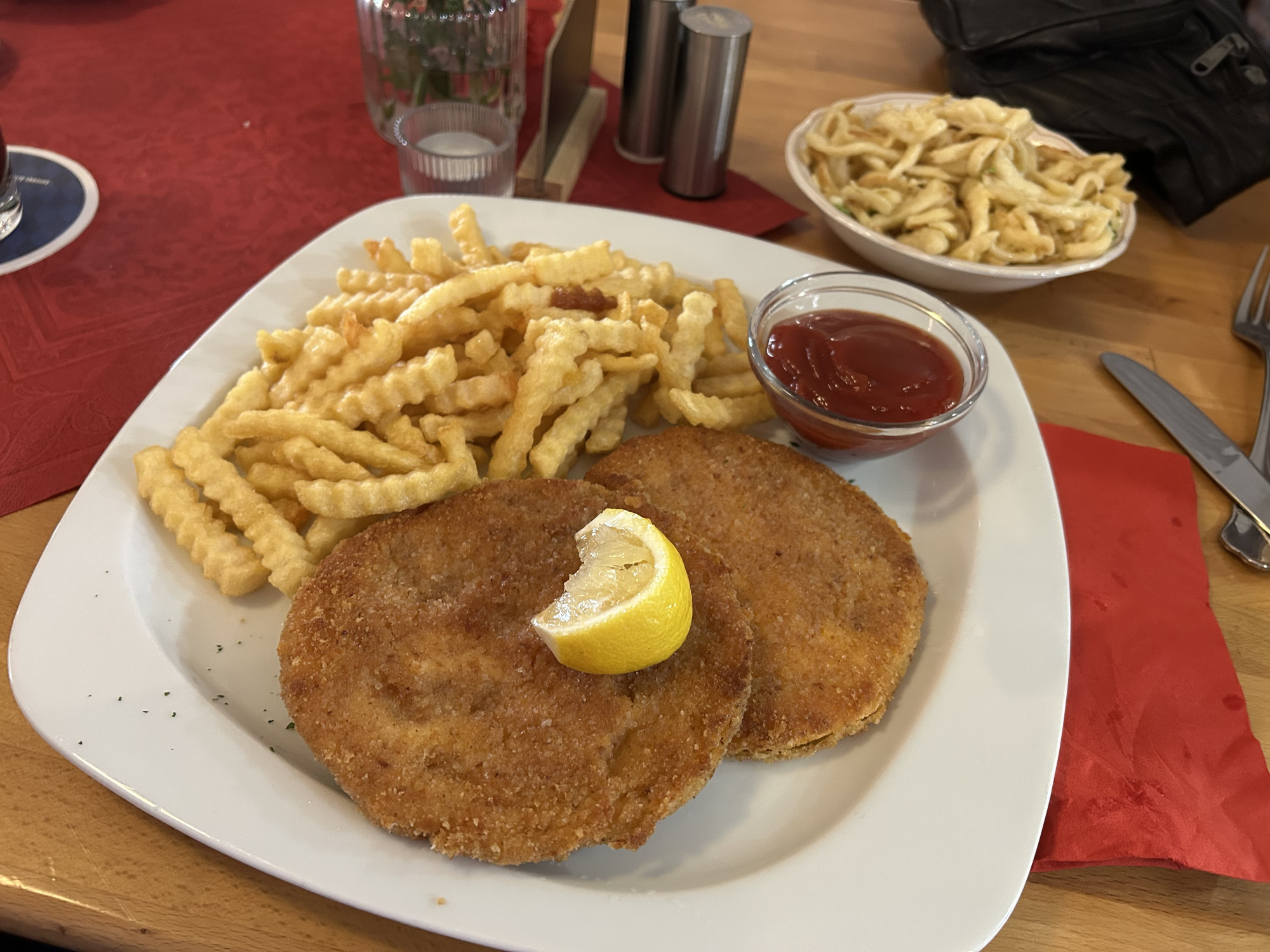 Vegetarisches Schnitzel, Zitronenscheibe, dazu eine Portion Pommes – das ist doch ganz ansehnlich.