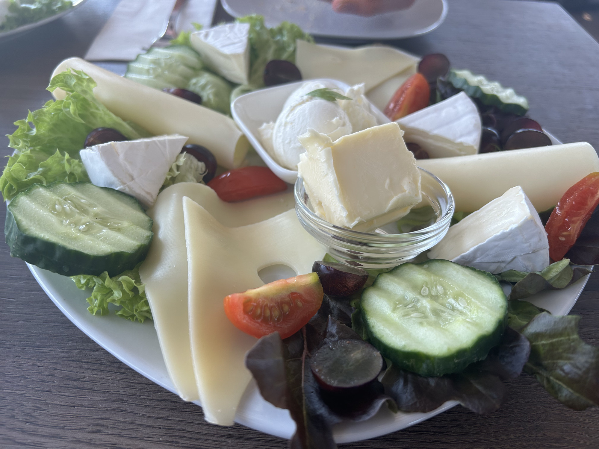 Als dann unsere Frühstückspyramide serviert wird, ist das Warten schon vergessen. Liebevoll hergerichtet türmen sich bei mir Käse und Knoblauchwurst, Marmelade und Honig, Salat und Gurke. Was mir sehr gefällt, ist der Fruchtjoghurt nebenbei. Sehr cremig und mit einer Blaubeere aufgehübscht wird meine Begleitung neidisch, die sich umgehend auch noch ein Schälchen dazubestellt.