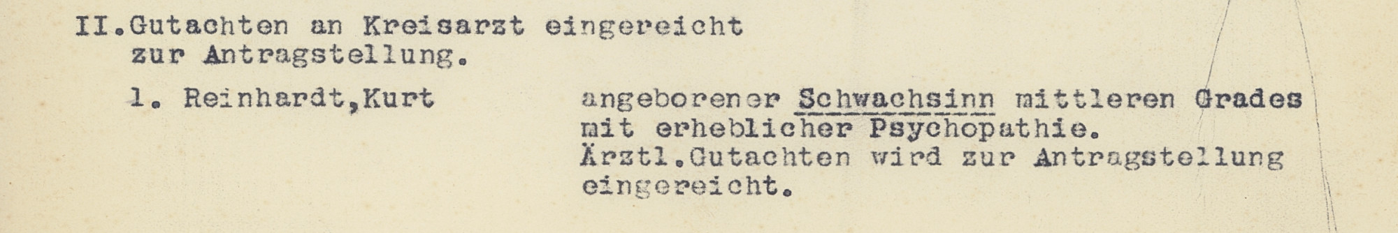 Dr. Walter Gerson diagnostizierte „angeborenen Schwachsinn mittleren Grades mit erheblicher Psychopathie“. Weil Kurt Reinhardt damit als „erbkrank“ galt, wurde er zwangssterilisiert.