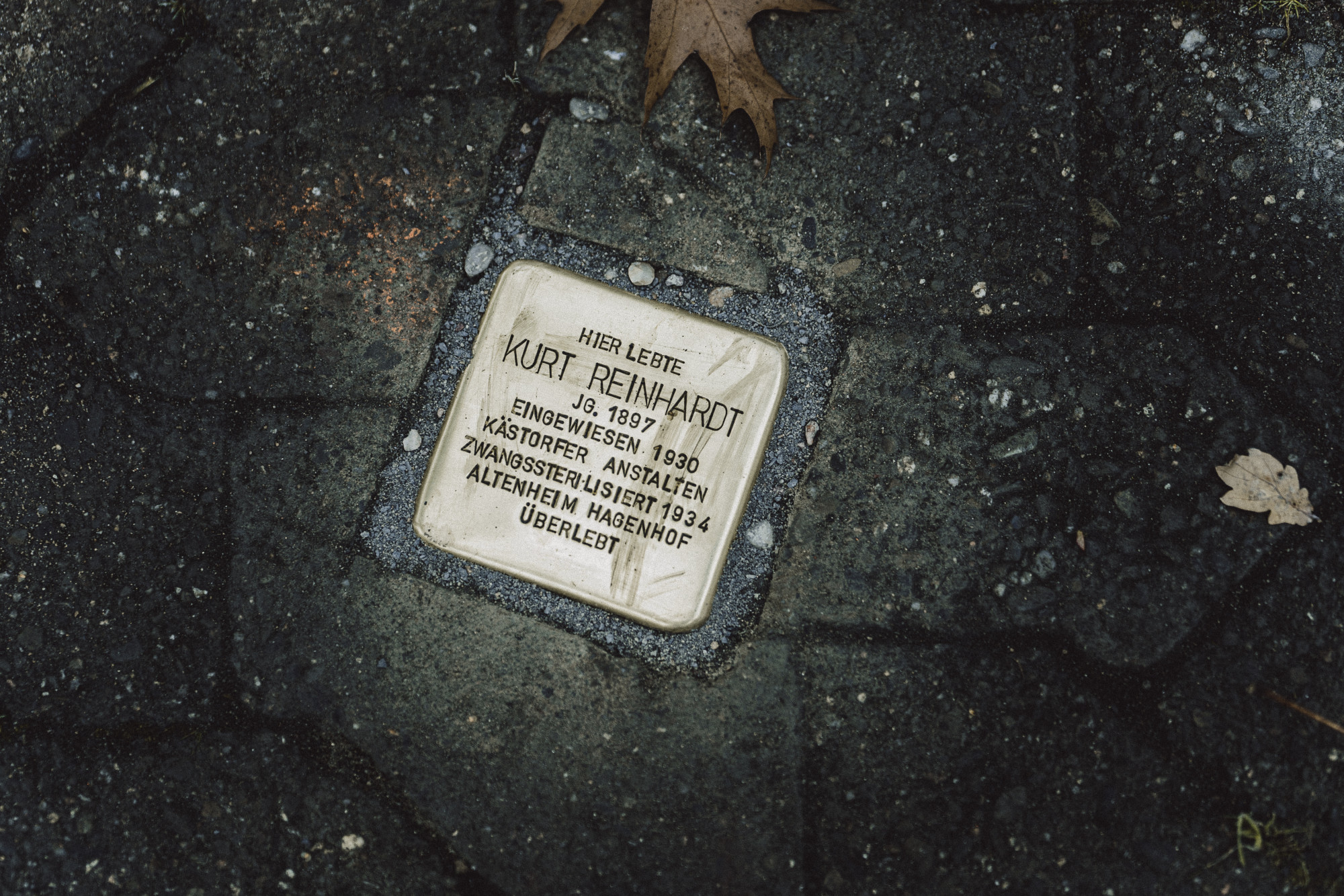 Der Stolperstein für Kurt Reinhardt, welcher ab 1930 als „jugendlicher Sieche“ im Altenheim Hagenhof lebte, erinnert an dessen Schicksal.