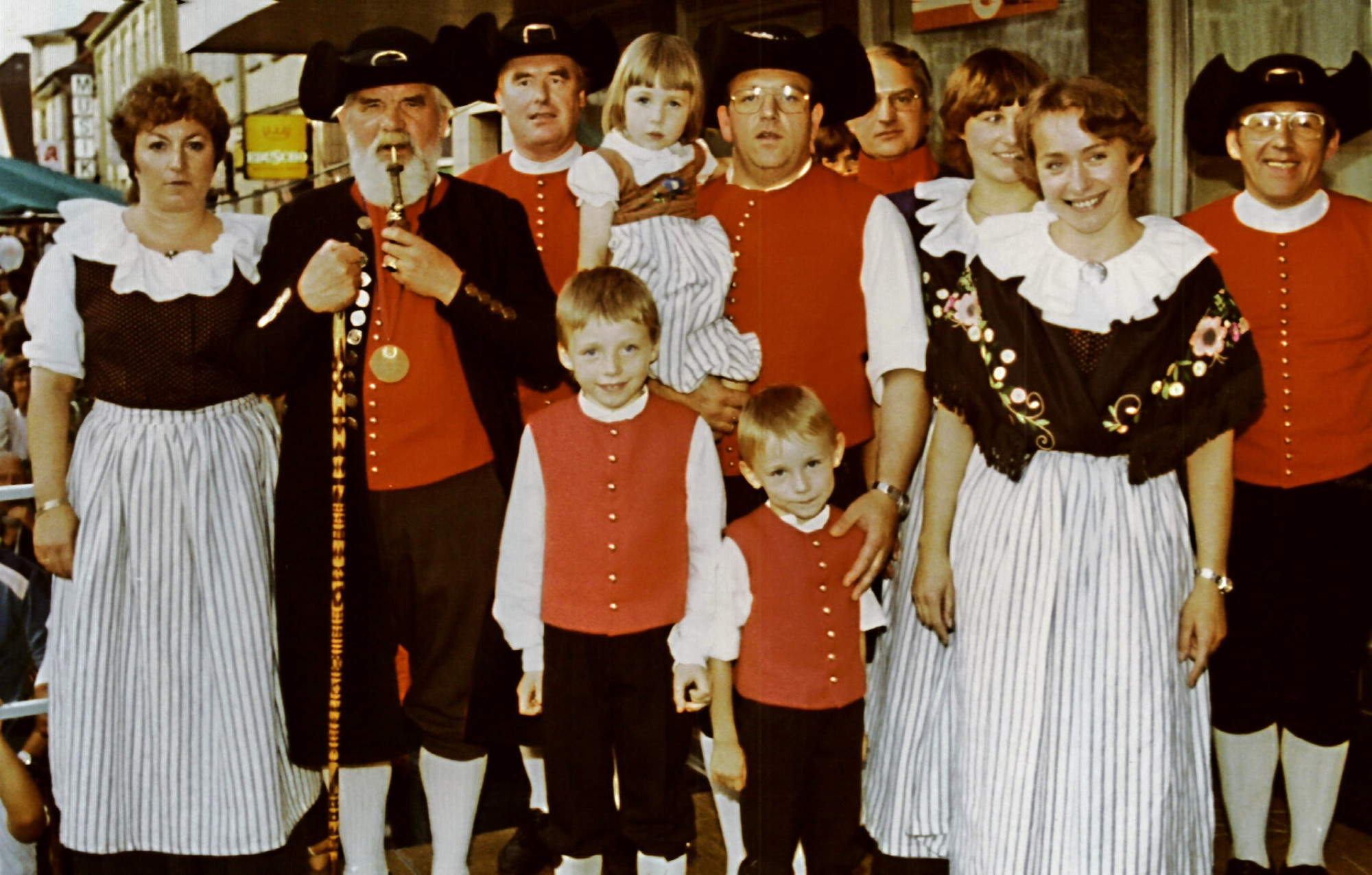 Gisela Schrader (von links), Hermann Momberg, Jürgen Schrader, Tell Roth, Christina Roth auf dem Arm ihres Vaters Heinrich Roth, Jörg Roth, Rüdiger Eggert, Bettina Heinemann, Inge Roth und Wolfgang Roth zeigten als erste stolz die wiederaufgelegte Gifhorner Tracht.