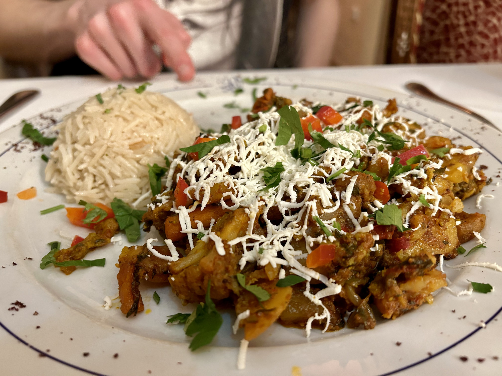 Und es geht sogar noch weiter: Die Hauptgerichte stehen diesen Mini-Feuerwerken in nichts nach. Mein Chudar Muschakala, ein weicher Auflauf aus Kartoffeln, Auberginen, Tomaten und Paprika, ist tief und umfangreich im Geschmack. Der heimliche Star aber ist der geraspelte Magermilchkäse, der mich sehr an Ziegen- oder Schafskäse erinnert. Und auch die Sauce meiner Begleitung, die sich für die Maccaroni entschieden hat, macht unheimlich viel auf. Ideal dazu passt im Übrigen der schwarze Tee, der mit Kardamom gewürzt ist und nach eigenem Belieben mit Kandiszucker abgeschmeckt werden darf.