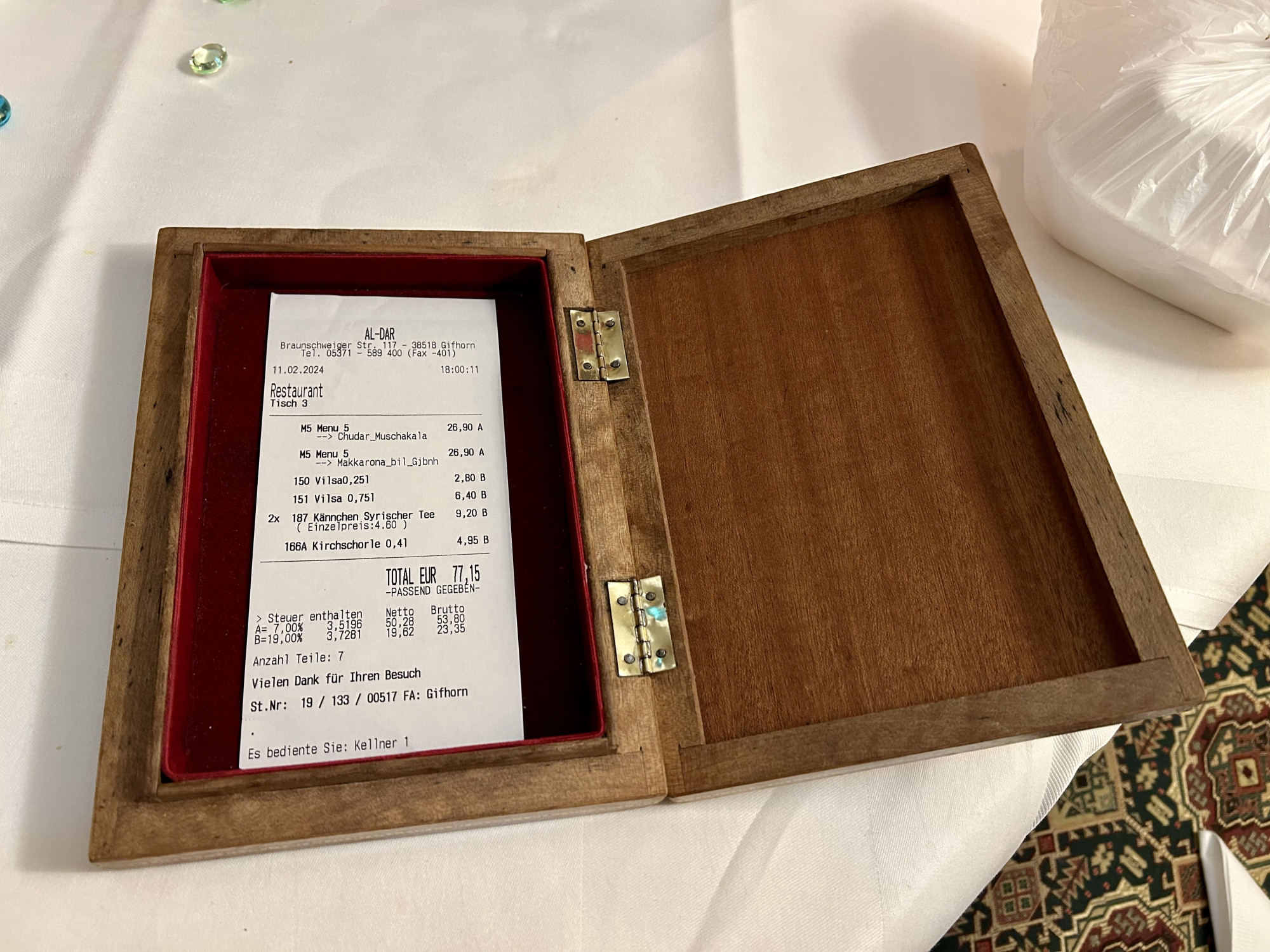 Noble Überraschung: Die Rechnung wird im syrischen Restaurant Al-Dar stilvoll in einer Holzkassette überreicht.