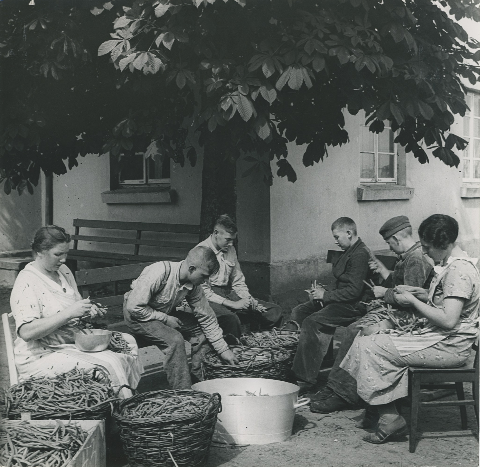 Jugendliche des Erziehungsheims mit Hausmutter und Hauswirtschaftsgehilfin beim Bohnen schnippeln im Jahr 1937.